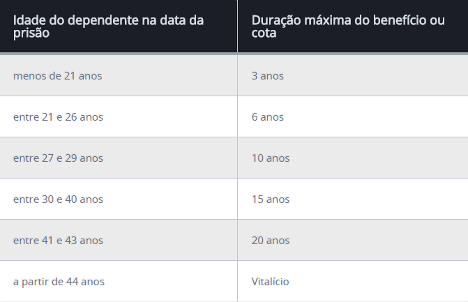 A duração do recebimento do auxílio depende da idade e condição do dependente. Caso o segurado seja posto em liberdade, fuja da prisão ou passe a cumprir pena em regime aberto, o benefício é encerrado.